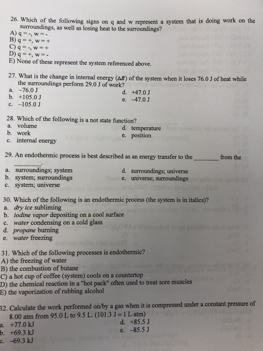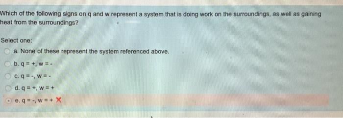 Which set of signs for q and w represent a system that is doing work on the surroundings and losing heat to the surroundingsa -q -wb q wc -q wd q -we None of these represent the system referenced above. Which of the following signs on q and w represent a system that is doing work on the surroundings as well as losing heat to the surroundings. Which of the following signs on q and w represent a system that is doing work on the surroundings as well as gaining heat from the surroundings. Aq w b q - w c q w dq - w e None of these represent the system referenced above. Correct answer - Which of the following signs on q and w represent a system that is doing work on the surroundings as well as losing heat to the surrou. How many orbitals are contained in the third principal level n 3 of a given atom. Q - w q w q w - q - w - None of these represent the system referenced above.